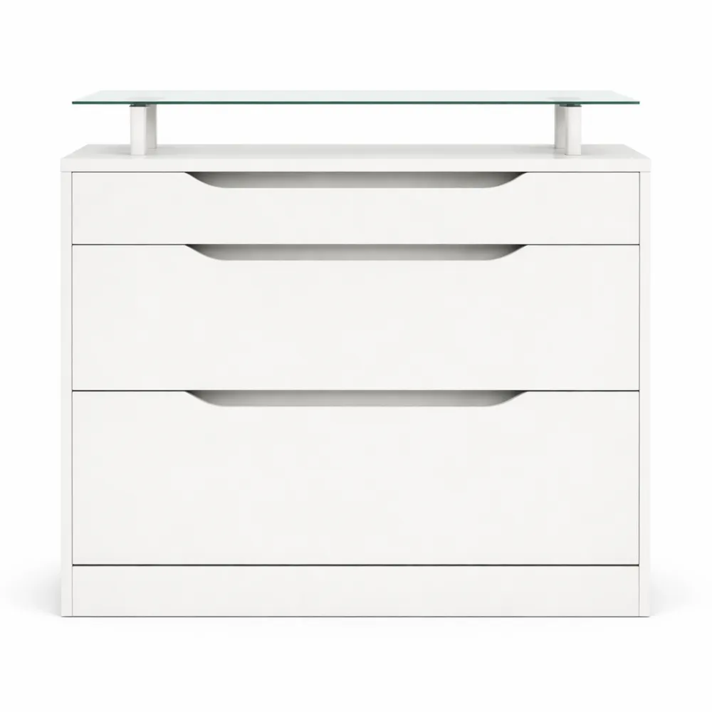 Ce meuble à chaussures offre un design simple avec une finition en verre. Il comprend deux tiroirs à porte rabattable, un tiroir supplémentaire, un comptoir et un plateau en verre pour ranger chaussures et petits objets. Construit en panneaux de particules et panneaux MDF, il assure une bonne stabilité et sécurité grâce à sa conception anti-basculement. Ce meuble optimisé pour le gain de place est adapté aux petits espaces.