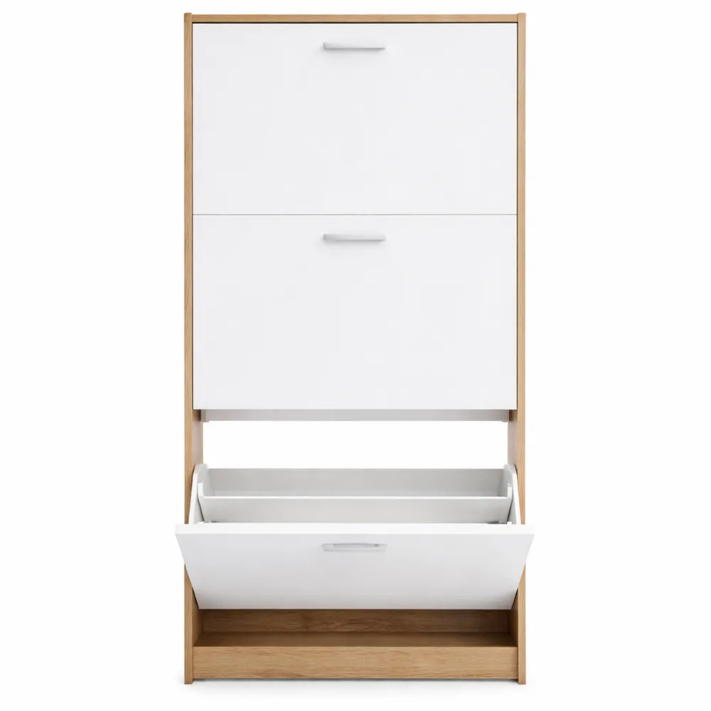CAPACITÉ DE RANGEMENT : Ce meuble à chaussures doté de 3 étagères rabattables peut contenir jusqu'à 18 paires. Conception pour optimiser l'espace. DIMENSIONS COMPACTES : L60xP24xH113 cm, ce rangement est adapté aux espaces étroits. Il s'intègre sans encombrer. MATÉRIAUX SOLIDES : En bois composite, il assure résistance et stabilité. ÉTAGÈRES AJUSTABLES : Les étagères réglables offrent un rangement personnalisé selon vos besoins.