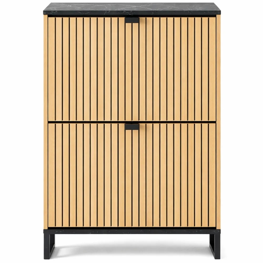 Équipé d'un système anti-basculement, il assure une bonne stabilité. Le tiroir basculant intègre une étagère réglable qui s'adapte à différentes hauteurs de chaussures. Les lignes épurées et le contraste entre le noir marbré et le bois clair naturel apportent une touche moderne à votre espace.